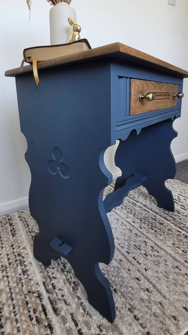 The base has been painted in Vencoe Blue and the desk top and draw front have been stained in dark oak, varnished for durability.